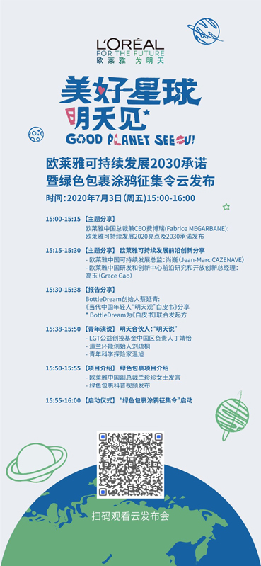 7月3号(周五)下午3点,欧莱雅中国将进行欧莱雅可持续发展2030承诺暨绿色包裹涂鸦征集令发布会。