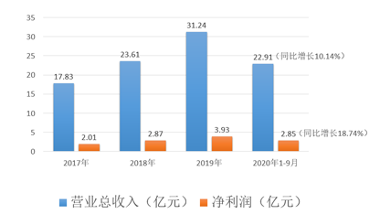 2017年至2019年营业总收入及净利润同比增长30%以上;2020年三季度营业总收入及净利润均同比增长10%以上。