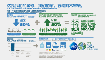 宝洁所发起的“这是我们的家”项目,表明了居家产品使用对于减少温室气体排放的重要意义。事实上,消费者对宝洁产品的使用是宝洁助力减少排放行动的最佳契机,也是宝洁与旗下品牌在应对气候变化过程中的主要关注点。在今年晚些时候,宝洁将出台具体的气候转型行动计划,其中将概述公司为实现范围一、范围二和范围三净零排放长期目标的相应行动。