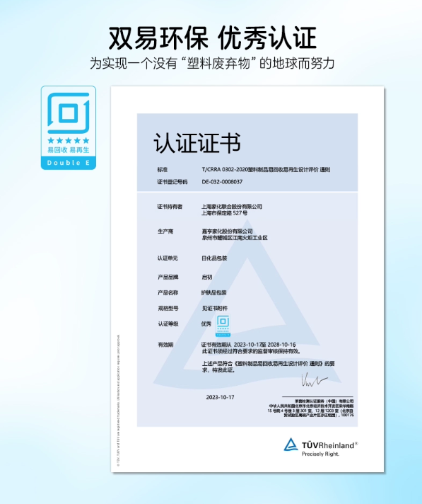 上海家化启初植物之初面霜包材于2023年10月正式获得了检测认证专业机构莱茵颁发的护肤品包装“双易”认证优秀评级的证书。据悉,这是国内婴童行业首张“双易”认证优秀评级的证书。