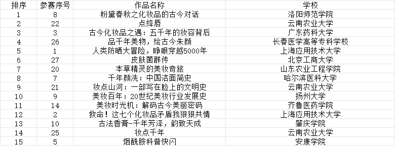 经专家委员会专家评审,确定以下15支队伍入围“华灼杯”第六届全国高校化妆品产品设计与创新大赛科普微视频赛道决赛: