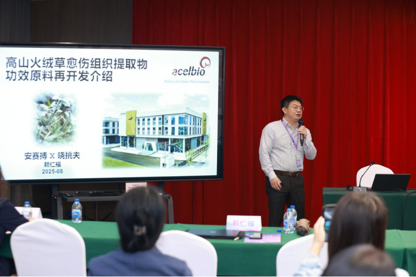 重庆安赛搏新材料技术有限公司开发部负责人赖仁福以高山火绒草为例,分享了《高山火绒草愈伤组织提取物功效原料再开发介绍》。深入探讨了提取工艺优化与功效验证的全过程,为珍稀植物原料的可持续开发提供了宝贵经验,也为行业带来了独特的原料选择。