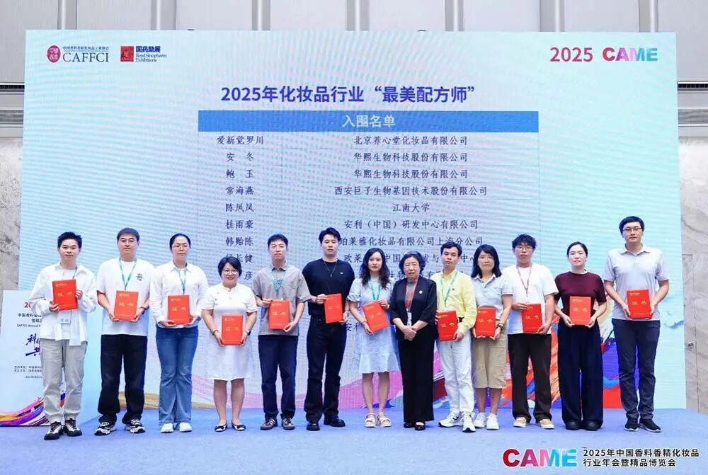 9月27日,在2025CAME中国香妆行业人才培养与发展论坛上,隆重举行“2025年匠心配方·科技向美——寻找化妆品行业最美配方师”活动颁奖仪式。本次活动是由中国香料香精化妆品工业协会(以下简称“中国香妆协会”)主办,中国香妆协会人才建设专业委会和中国香妆融媒体联合承办,旨在深入贯彻人才强国战略,加强行业人才队伍建设,弘扬精益求精的工匠精神。经专家评审委员会的审核,最终共有26位化妆品配方师荣获2025年“最美配方师”称号。