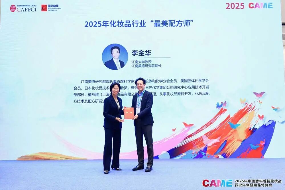 中国香妆协会颜江瑛理事长为2025年化妆品行业“最美配方师”代表李金华教授颁发证书。