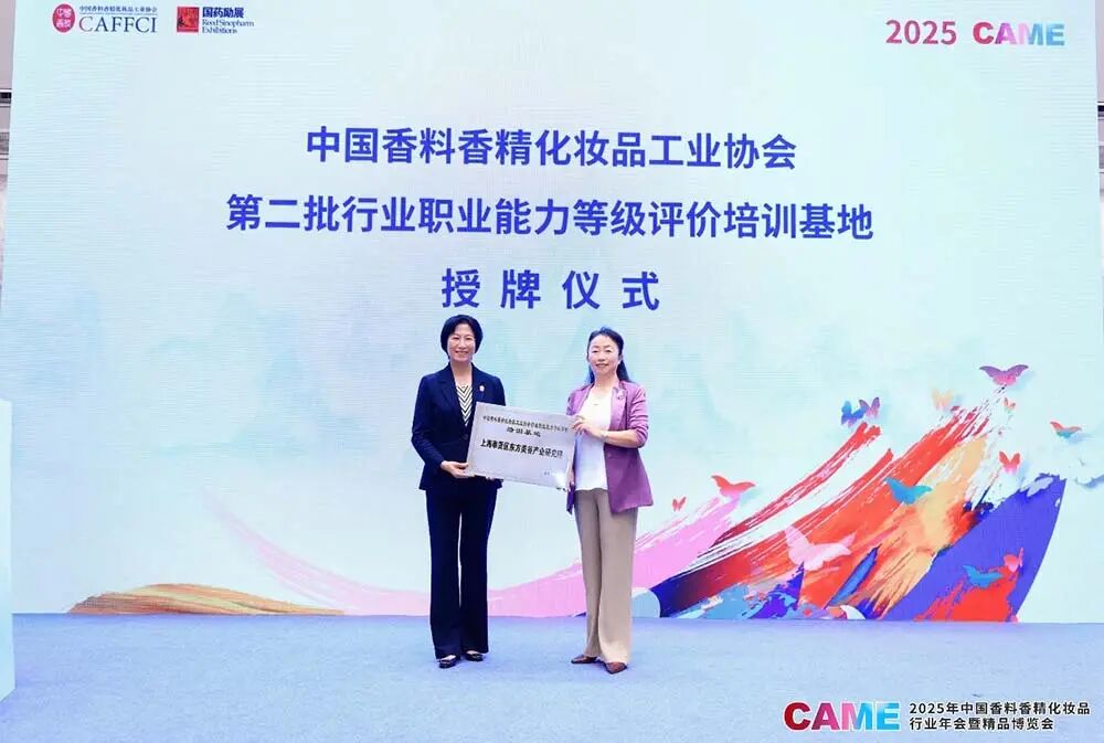 成立仪式期间,中国香妆协会理事长、人才专委会主任委员颜江瑛医学博士为第二批中国香妆协会行业职业能力等级评价培训基地——上海奉贤区东方美谷产业研究院授牌。