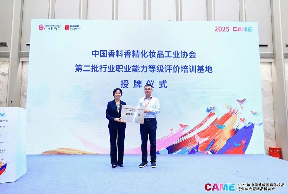 中国香妆协会理事长、人才专委会主任委员颜江瑛医学博士为第二批中国香妆协会行业职业能力等级评价培训基地——中国药科大学授牌。
